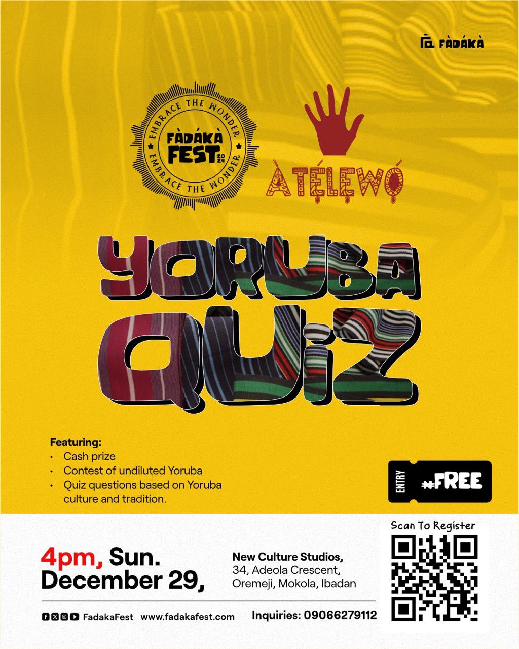 Welcome to Fàdákà Fest 2025! This December, immerse yourself in an unforgettable cultural experience that celebrates the richness of Nigerian art, music, dance, film, and more. Fàdákà Fest is where tradition meets contemporary expression, and creativity flourishes.